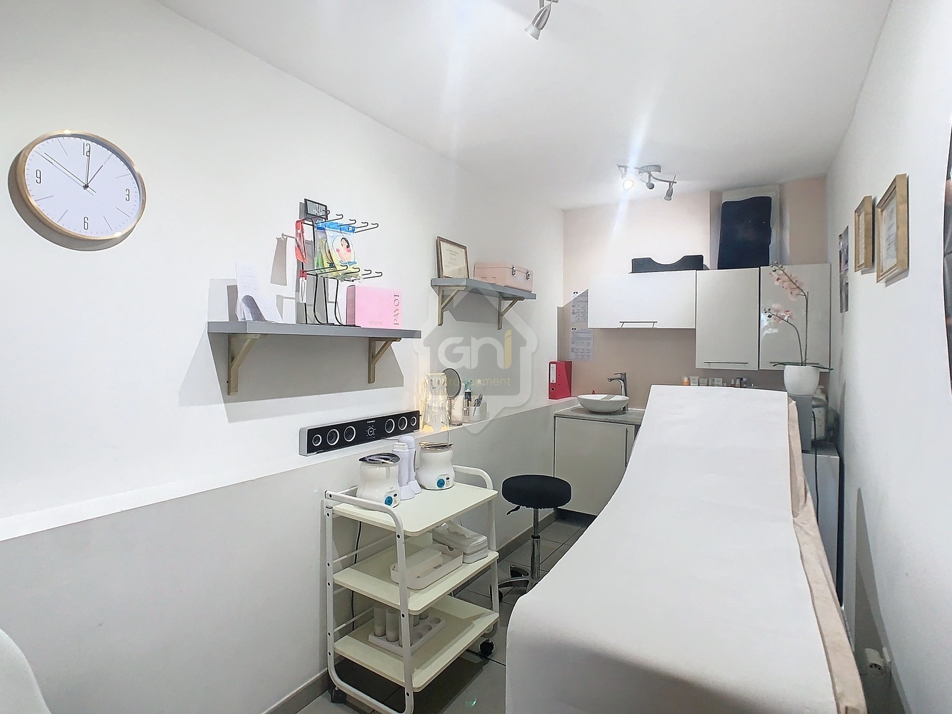 Il est composé d'un espace d'accueil / vente / soin pieds et mains, d'une cabine massage, d'un hammam, d'une cabine soin visage et d'un étage pour du stockage.
