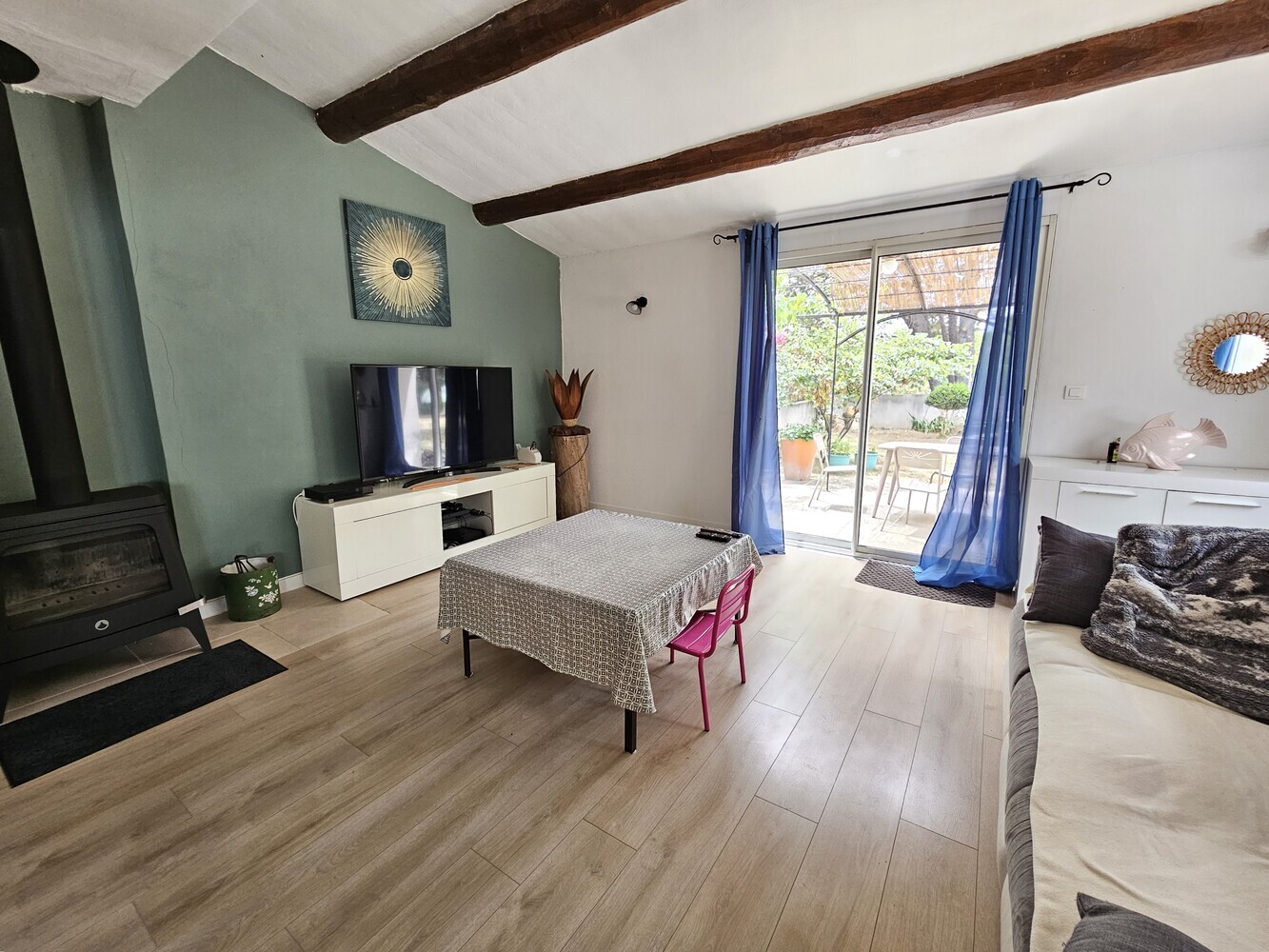 A proximité des commerces et dans une impasse au calme, cette maison avec vue dégagée, se compose de : 1 entrée, 1 buanderie / cellier avec WC , 1 cuisine récente équipée s’ensuit une pièce de vie composée de 2 beaux espaces avec 1 salle à manger avec 1 salon de 36 m² avec poêle à bois haute performance, donnant accès à une pergola et sur le jardin avec vue dégagée