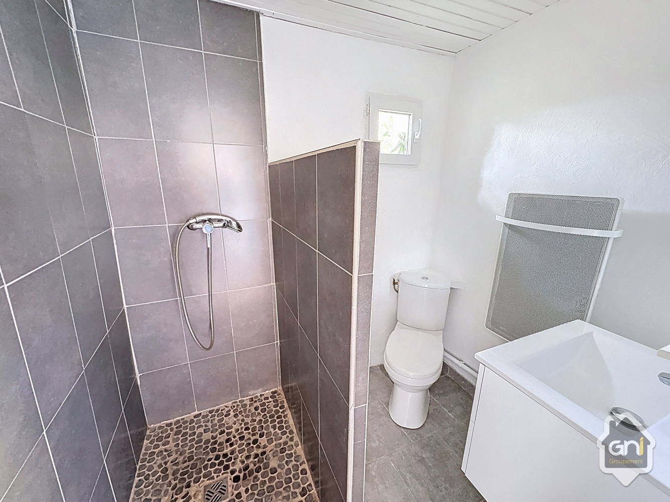 En rez-de-chaussée, une entrée sur un séjour/salle à manger, cuisine ouverte, une salle d'eau avec WC, une belle terrasse bois.